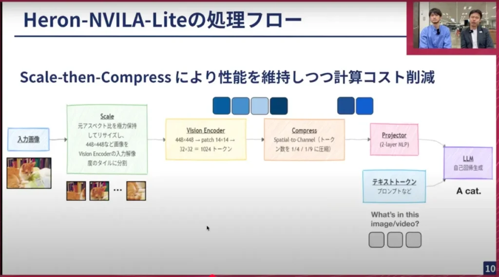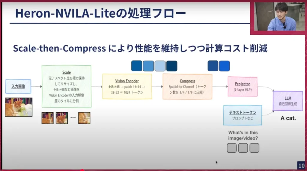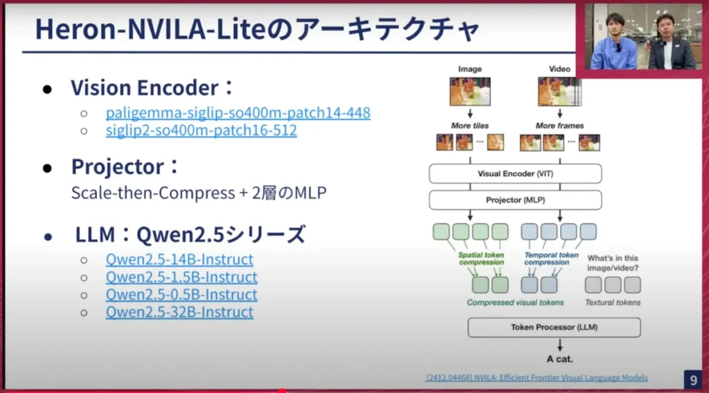 横井:はい。アーキテクチャは、基本的に去年の12月頃にNVIDIAが出したNVILAというアーキテクチャを活用しています。先ほど述べたように、Vision Encoder (ViT) とProjectorとLLMという3段構成のもので、そこにProjectorのところに書いてある「Scale-then-Compress」という工夫を詰め込んだところが、NVILAの特徴の一つになっています。