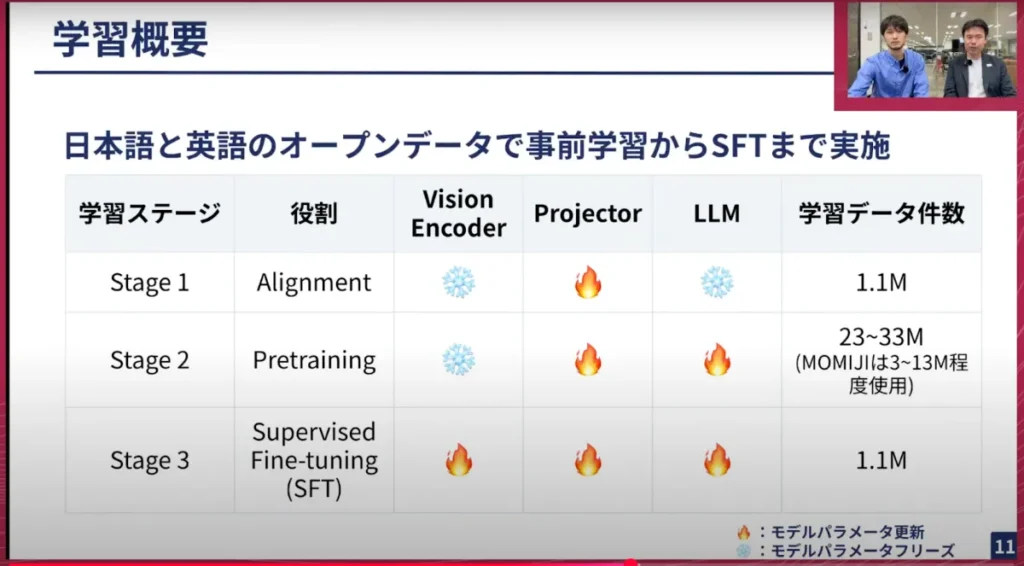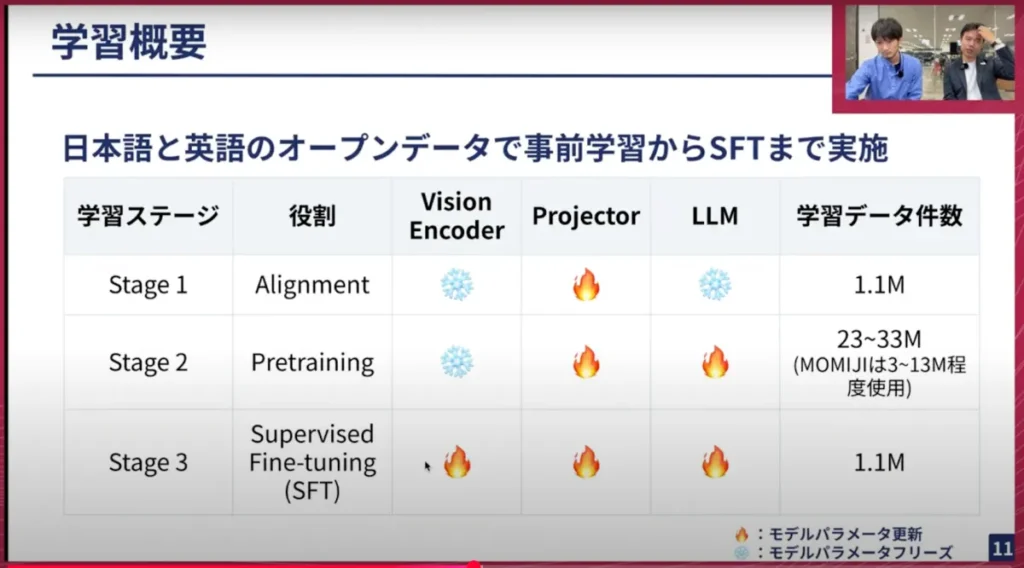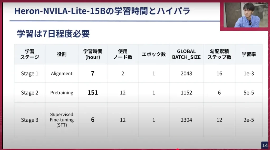 NVILAの元の論文ではステージを5回学習するのですが、今回日本語のデータでそれに対応するものが取得しづらかったため、できる範囲のステージで学習を行ったという事情があります。データは、日本語と英語のオープンデータを全て使って学習し、クローズドなものは使っていません。