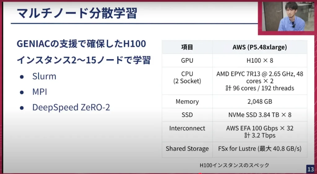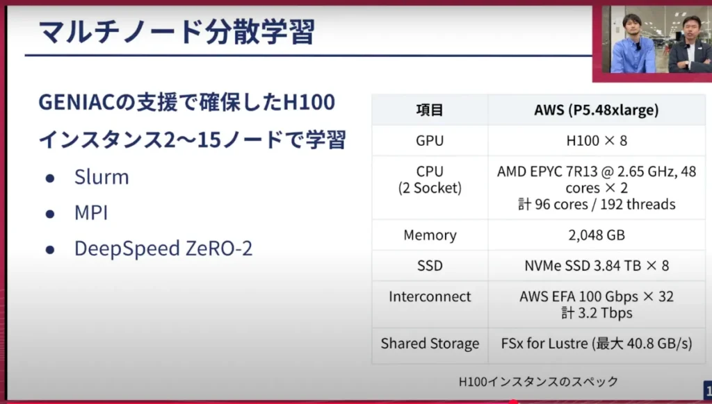 横井:GENIACの支援で、AWSでH100ノードが16ノードほど利用できる状況だったため、そこでの複数ノードを使った分散学習を行ってきました。ノードというのは、GPU H100、VRAMとしては80GBあるGPUですが、それが8枚載っているサーバーが1ノードです。それを15や16ある形で計算していきました。
