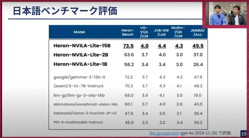 横井:今回は、VLMのHeron-NVILA Lightを開発しました。最近出た最先端のモデルと比較すると、機能面でやや見劣りする点もありますが、それでもGoogleのGemini 3やAlibabaのQwen 2.5-VLなどと一部のベンチマークでは匹敵する精度が出ています。