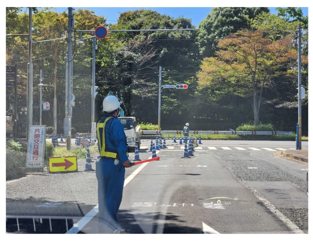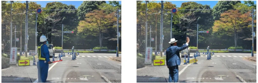 下の写真には工事現場と交通誘導員・タクシーを待っている人が写っています。私たちは左側写真の状況を見た時に、「交差点に信号機があるが、交通誘導員の指示を優先的に従う必要がある」と判断することができます。