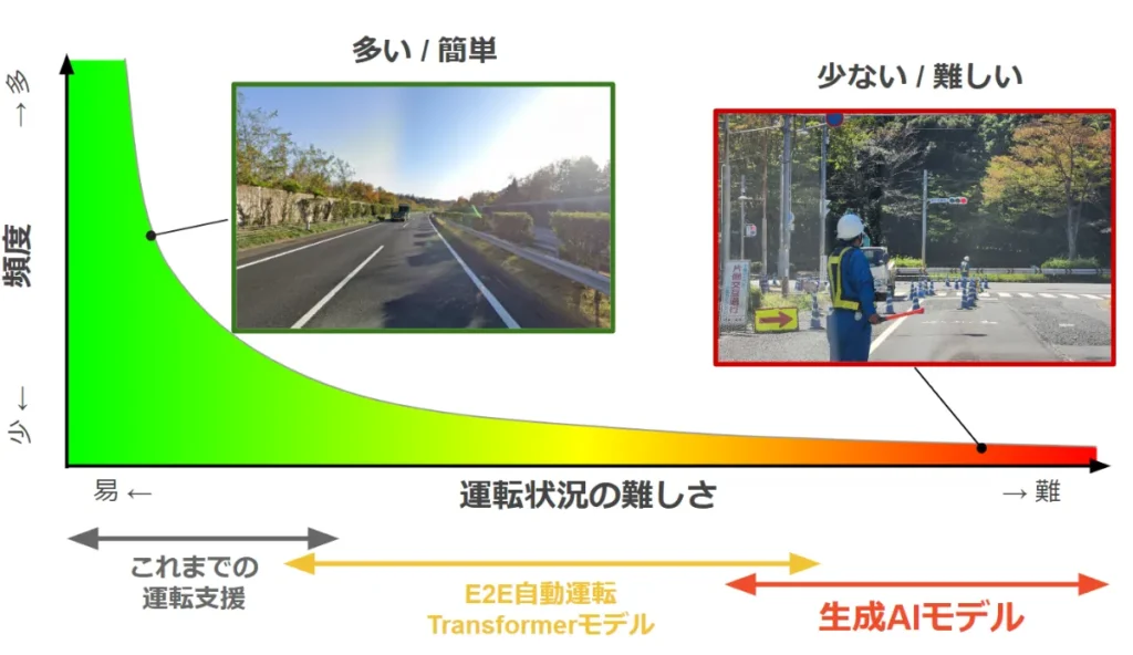 図の右側には運転として難しく、発生頻度が低いケースが存在します。上記の工事現場が該当します。自動車の運転シーンではこのような頻度が低く、運転状況としては難しいケースが多岐にわたり、このため横軸が永遠に伸びる「ロングテール事象」として知られています。