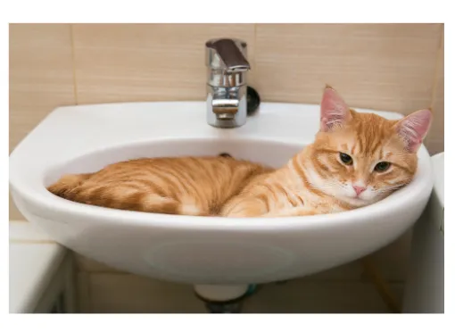 白い洗面台の中に、オレンジ色の毛並みをした猫が横たわっています。猫は洗面台の縁に寄りかかっていて、頭だけ外に突き出し、こちらをぼんやりと見つめています。