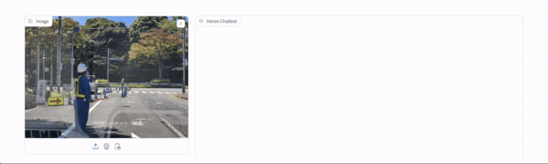 言語情報としてHeronが出力していますが、工事作業員が交通整理をしていること・交差点周辺であること・歩行者などがいることなど、まさに生成AIであるHeronが複雑な状況を整理してくれていることが分かります。